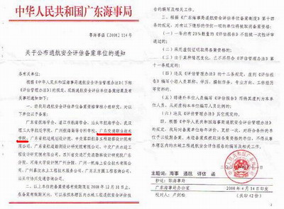 根据《中华人民共和国海事局通航安全评估管理办法》和粤海事函〔2008〕12号“关于开展通航安全评估单位备案的通知”的精神, 学院于2008年2月向广东海事局申请开展通航安全评估单位备案,2008年4月广东海事局审核批准我院可承担本辖区内水域工程通航安全评估。