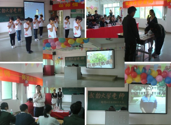 颂师德 展风采 念师恩 ——"我的大学老师"师德教育示范团组织生活 在这个花香满园,硕果累累的季节里,老师用最动听的语言向同学们传授人生的真谛,引领同学们遨游知识的海洋。为歌颂老师爱岗敬业、关爱学生、严谨治学、廉洁从教、终身学习、为人师表的高尚品德,表达对老师"年华奉献苦耕耘"的恩情,由海事与港航学院主办,物管091班、楼宇091班和航海093班承办的"颂师德,展风采,念师恩"为主题的师德示范性团组织生活于11月1日举行。 莅临现场的领导和嘉宾分别是学院副院长洪志杰教授,学院团委刘青副书记,北校区学生科邱晓毅科长,我院党总支徐超书记,杨伟莹书记,练崇权老师、郑木溪老师、肖泽英老师以及楼宇091班班主任梁永演老师。 活动首先以视频《班级风采展示》作为导入,让同学们回忆起老师和同学团结合作,共同成长的点点滴滴,既有微笑,也有汗水,美好而珍贵。"春蚕到死丝方尽,蜡炬成灰泪始干",楼宇091班的张罗明同学伴着优美的旋律,用甜美的嗓音深情地为大家朗诵《师德颂》,字里行间包含着对老师无限的感激之情。接下来,图音文并茂的幻灯片演示,透过屏幕描绘了学院领导、专业教师、班主任为学生成长成材兢兢业业、不辞劳苦乐于忙碌的身影,突显了老师对学生的关怀,体现了老师教书育人、敬业奉献的职业道德。在座的学生代表此时已按捺不住满腔的激情,纷纷踊跃发言,尽述心中感恩情。"此时无声胜有声",手语表演《感恩的心》再次表达对园丁们的衷心感激。活动接近尾声,同学当场挥洒笔墨,"学为人师,行为世范",用遒劲有力的书法赞美老师的敬业爱岗之魂。 宛如清泉般的音乐再次奏响,洪院长与在座师生共享了自身对大学老师师恩的感怀,对本次团组织生活给予了充分肯定,并希望同学们继续心怀感恩,老师继续辛勤耕耘,师生携手共进,在青春的蓝天下共创广交院的美好明天。 海事与港航学院 2010年11月1日 |