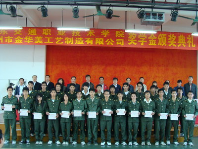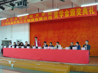 捐资助学同育人 校企合作齐发展 2010年12月8日下午4点20分,海事与港航学院在综合楼八楼隆重举行"广东交通职业技术学院广州市金华美工艺制造有限公司奖学金"颁奖典礼。广州市金华美工艺制造有限公司董事长汤静华先生、技术总监胡树荣先生、人事行政经理陈涛先生、生产部经理何显意先生,北校区管理办公室司徒汉主任、朱和平副主任,教务处叶华副处长、招生就业处邓海荣副处长、学生工作处李永斌副处长、北校区团委刘青书记,我院黄勇亮院长、党总支徐超书记、聂玉强副院长、黎法明主任、机电系宋春华副主任以及机电系教师、辅导老师和机电系在校生600多人出席了此次颁奖典礼。 典礼上,黄勇亮院长致欢迎词。他回顾了两年多来,我院和金华美公司在专业建设、人才培养模式改革、企业实习等方面合作成果,介绍了金华美奖学金的评比过程。徐超书记宣读了表彰决定,谢阳海等2位同学荣获"金华美奖学金"特别奖,廖健星等4位同学荣获"金华美奖学金"一等奖,蔡锐杰等8位同学荣获"金华美奖学金"二等奖,李水娟等12位同学荣获"金华美奖学金"三等奖。 物设081班的谢阳海同学作为获奖学生代表发言,他感谢广州市金华美工艺制造有限公司对求学道路上的学生们提供如此有力的帮助,感谢学校的培养,表示自己将加倍努力,不辜负公司、学校和家人的期望,同时号召同学们勇往直前,共同努力、共同进步。