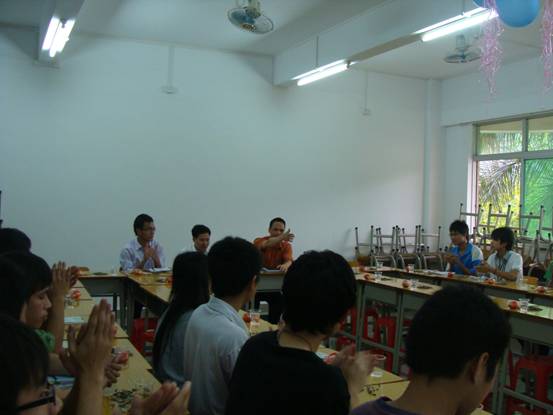 座谈会以PPT播映心理委员们在心理培训时的汗和笑开始,每一句简短的话和优美的背景音乐让在场的人都会心一笑。随后进入了心理委员的提问环节,主要是由心理会员把自己不懂或者在辅导同学的时候遇到的问题向老师提问。练崇权老师作出耐心和细心的回答,在场的心理委员都茅塞顿开。主持人简短的总结后,带入了下一轮的环节。这个是一个游戏环节,规则是播一段音乐,台下的人传瓶子,音乐停了,谁拿了瓶子就谁回答一个关于心理方面的问题。愉快的时间总是很快过去,游戏在欢笑声中结束。最后由伍雄晖书记作出详细的点评和对这次活动给予充分的肯定。  这次的心理委员座谈会,是一次成功的交流会,它解决了心理委员在工作中遇到的问题,让心理委员们更好地为学生们的心理健康做出更好的贡献。 海事与港航学院 2011年4月15日 |