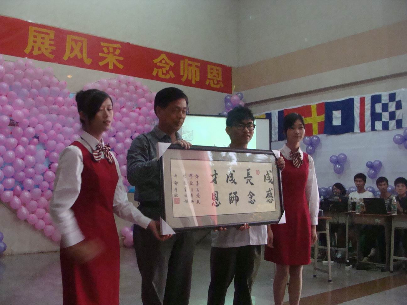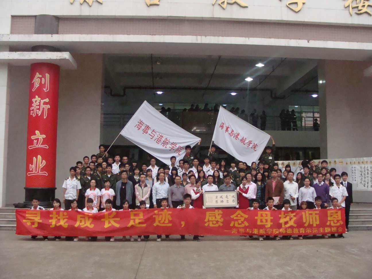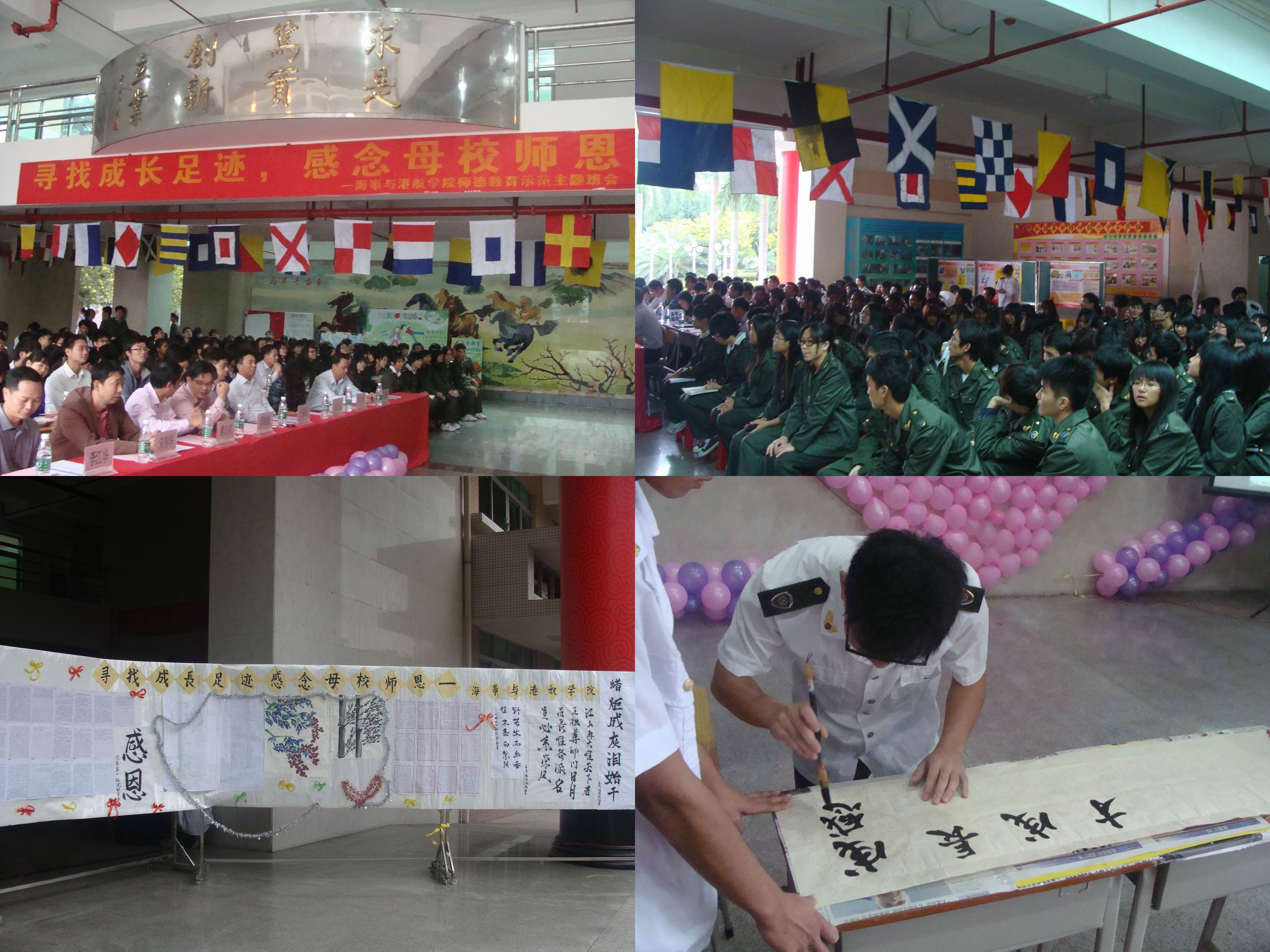 为加强大学生的思想道德建设,培养全院青年学生尊师重教、感念师恩的良好道德情操, 11月21日下午,海事与港航学院在综合楼首层隆重举行《颂师德·展风采·念师恩》——"寻找成长足迹,感念母校师恩"师德教育系列活动成果展暨示范性主题班会。  学院纪委王顺达书记、北校区党委郑立高书记、北校区团委刘青书记、学生工作处邱晓毅副处长,我院党总支伍雄晖书记、黎法明副院长、宋春华副院长、综合部门、二级学院辅导员老师及班主任、学生代表近200人参加了本次活动。 此次师德教育活动成果展主要包括《寻找学生成长足迹,细微之处见师德》之师德风采视频展示等八个环节,形式多样,能够结合学生成长成才足迹,多层面、多角度、多维度展现师生情谊,活动效果良好、立意新颖、特色鲜明。  学院纪委王顺达书记最后作讲话,从自己1975年就在学校从事教育事业的亲身经历谈起,在奉献教育事业30多年中,有苦有累,而收获的是——学校教育事业蒸蒸日上、学生成长成才;王书记还对在场师生提出几点希望:一是希望教师爱岗敬业、关爱学生;二是希望学生刻苦钻研、求是笃实;三是希望在场师生勇于创新、奋发进取、淡泊名利、志存高远。  活动中,学生代表有感而发、现场挥豪,并为王顺达书记赠送了《成长成才,感念师恩》书法作品。活动结束后,领导、老师还与全体同学合影留念。 海事与港航学院 2011年11月22日 |
