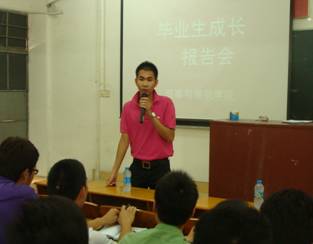 5月26日下午,教学楼308课室里洋溢着浓浓的期待,李土桂的到来受到船电班所有同学的热烈欢迎。作为06届机电一体化专业,在广州明洋有限服务公司任助理电机员的李土桂,应杨伟莹老师邀请回校为船电师弟师妹们作了以《大家一起谈船电》为主题的毕业生成长报告会。近百名船电学子参加本次报告会,并以提问的方式与李土桂进行现场互动,让船电的同学们从李土桂的亲身经历中,进一步了解本专业的职责要求及就业情况。 首先,李土桂介绍了在远洋船上的工作和生活环境,以轻松、幽默的谈话方式拉近与同学的距离,针对船电专业的特点和学生所关注的问题,给了船电的同学以下几点建议: 一、 远洋职业对英语水平要求较高,在平时的交流和操作都会用到,会遇到很多外国人并且很多仪器都用英文标注,所以学好英语很关键; 二、 掌握扎实的专业技能,尤其是PLC和制冷技术以适应现代船舶技术的发展; 三、 确定目标,态度决定一切,不要认为专科生就比本科生低一等,动手能力强、敢拼都是我们自己的优势; 四、对专业要有信心,随着科技的发展,清洁能源越来越受重视,而电能将会发挥它更大的优势,船电学子未来有更宽广的舞台。