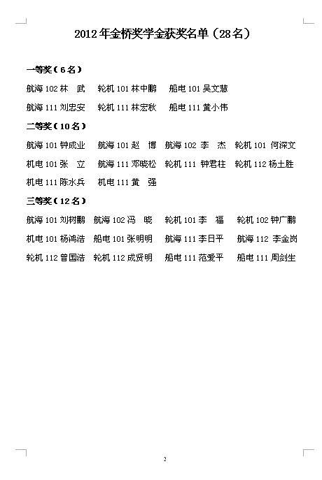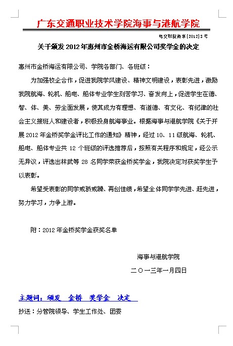 关于颁发2012年惠州市金桥海运有限公司奖学金的决定