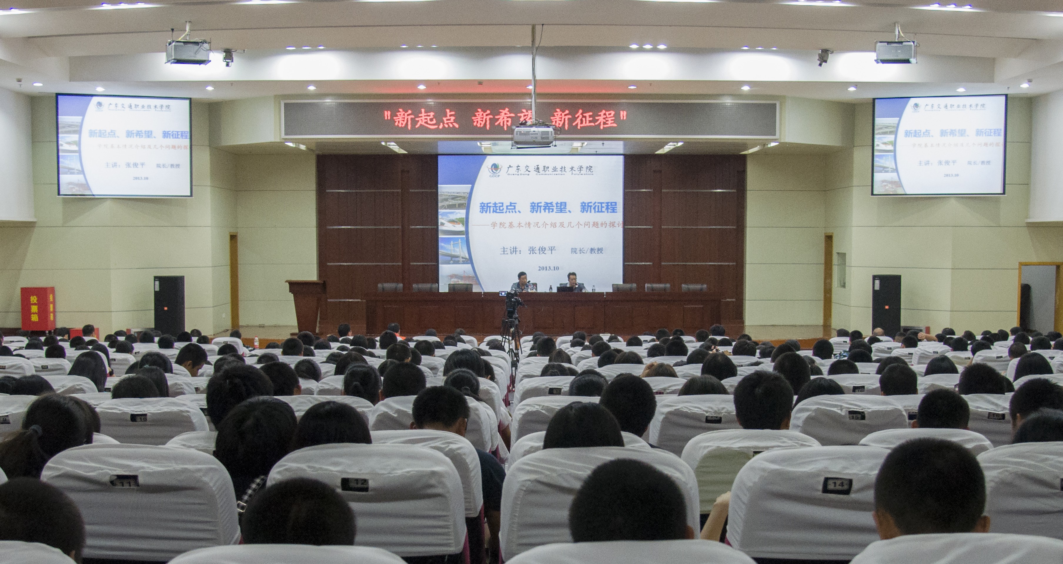 张俊平院长以“新起点、新希望、新征程”为题,从“关于交院”、“大学与高中的区别”、“高职如何成就学生的事业”、“如何让大学生活更有意义”、“三点希望”等五个方面展开。