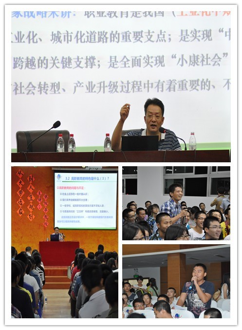 张院长以学者的口吻向新生介绍了学院发展历程、特点与所取得的成绩,客观指出学院在办学条件上存在的一些不足,以黄埔军校比较简陋的校舍中走出许多近代伟人为例,鼓励新同学努力学习,早日成才。对于“大学生”的内涵,张院长认为:“大即大人:多元选择,责任担当”、“学即学习:自主学习,个性发展”、“生即生活:独立生活,集体空间”。张院长从宏观、中观到微观向同学们详细阐述了高职教育的发展前景,通过成功校友的鲜活案例阐明高职院校能成就学生的事业,并深入浅出地从“心态培养、三观铸造、博览群书、目标设定、全面发展与运动习惯养成”等方面引导学生更好地渡过大学生活,避免迷失方向,同时寄语大一新生要“学会做人”、“学会做事”与“学会学习”。讲座结束后,张院长与同学们进行了亲切交流,耐心解答同学们提出的问题。