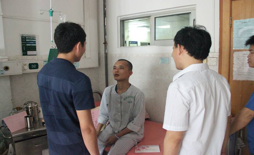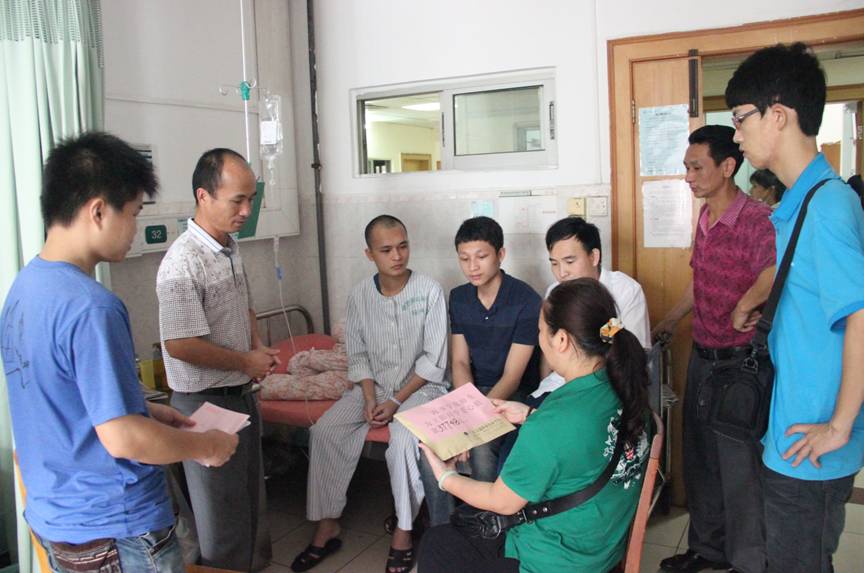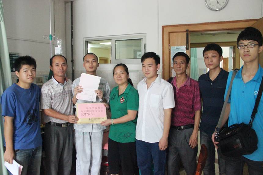 5月24日,我院党总支刘青书记、班主任叶强老师、分团委叶培发老师及学生代表等一行七人到中山大学孙逸仙纪念医院看望王阳同学,转达全院师生对他的问候并将捐款送到王阳同学手中。学院领导、老师向医生和家属详细了解了病情与治疗方案,鼓励安慰王阳同学。