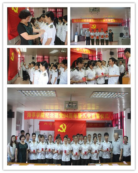 入党宣誓仪式在激昂的国际歌声中拉开了帷幕会。练崇权同志首先通报了本学期学生党支部党建工作的概况;接着,蔡佩林副书记领誓,新党员接受教师党员佩戴党徽并面向党旗进行庄重的入党宣誓仪式;随后,刘青书记作纪念建党94周年讲话,共同回顾中国共产党94年来所走过的不平凡的发展历程,号召全体党员铭记党史,以实际行动践行党的十八大以来的各项会议精神和社会主义核心价值观,并提出五点具体要求:一是加强理论学习,争当“三严三实”信仰者——在思想觉悟中“落地”;二是勇于实践,争当“三严三实” 示范者——在知行合一中“结果”;三是创先争优,争当“三严三行”推动者——在日常工作中“生根”。仪式上,刘青书记、蔡佩林副书记为在党员民主考核评议活动中荣获“优秀”等级的四名学生党员颁发荣誉证书,其他教师党员为新党员颁发了党员证。(文图/ 练崇权)