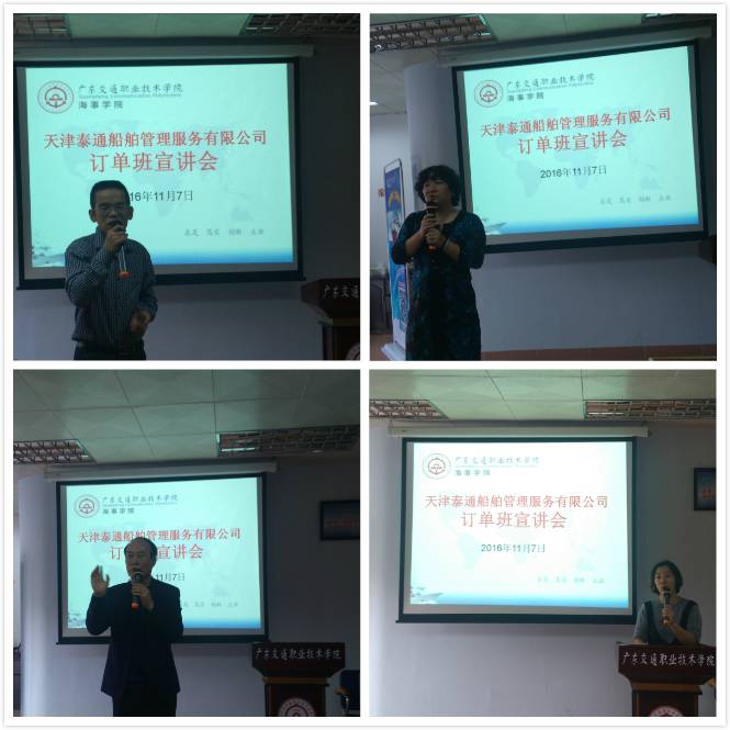 天津泰通船舶管理公司是一家具有甲级资质,海员外派机构的船舶管理公司。先后派出整套班子船舶12条,派出船员600百多名,在册1200人,为国内外船东提供远洋、东南亚、中日韩及中国沿海航区的船员管理。刘青书记对该公司的到来表示欢迎,蒋祖星院长在讲话中强调,航运行业的不断发展,航运人才需求日益巨大,高质量航运人才更是供不应求,订单班的成立有利于增强学生职业认同感、提高考证通过率,从而进一步提升毕业生质量和培养出投身航运事业的决心。
