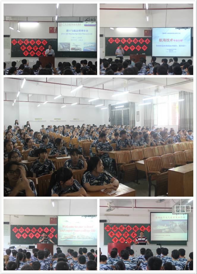 港口与航运管理、航海技术、轮机工程技术、船舶电子电气工程技术专业介绍负责人从人才培养目标、课程安排、毕业生应具备的知识、素质和能力,以及将来的职业领域与岗位,和我院丰富的教学实训资源保障等方面深入浅出的为新生进行详细介绍。有的老师结合当前的宏观经济形势,“一带一路”重大战略、广东自由贸易试验区建设和创新驱动、粤港澳协同发展的大好契机,为新生指引了前进的方向,树立新生学习航海专业、考取航海专业大证、从事航海事业的信心。有的老师从学生发展的方面,指出从中学升入大学,进入全新的阶段,学习专业知识很重要,但更重要的是要在大学集体生活中培养新海员应当具备的人际交流能力、适应环境能力,打造航海类技术核心竞争力,塑造新海员独特的职业素养,养成积极健康的心态。
