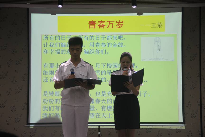 习近平总书记谈到,“大学时代是令人难忘的青春记忆”。最后,2016级新生代表轮机161朱登峰、港航161陈姿霖为大家带来诗朗诵《青春万岁》,诗歌中理想主义和浪漫主义的情愫,在2016级新生中激起强烈的共鸣。