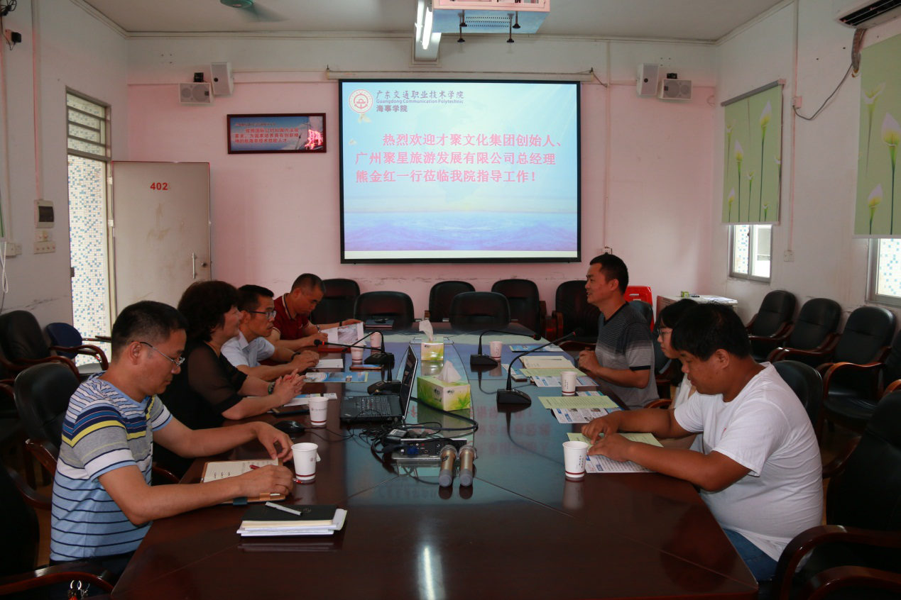 6月2日,才聚文化集团创始人、广州聚星旅游发展有限公司总经理熊金红一行莅临我院洽谈校企合作事宜。我校海事学院院长蒋祖星教授、党总支书记刘青、副院长叶翠安、黎法明接待并进行座谈。