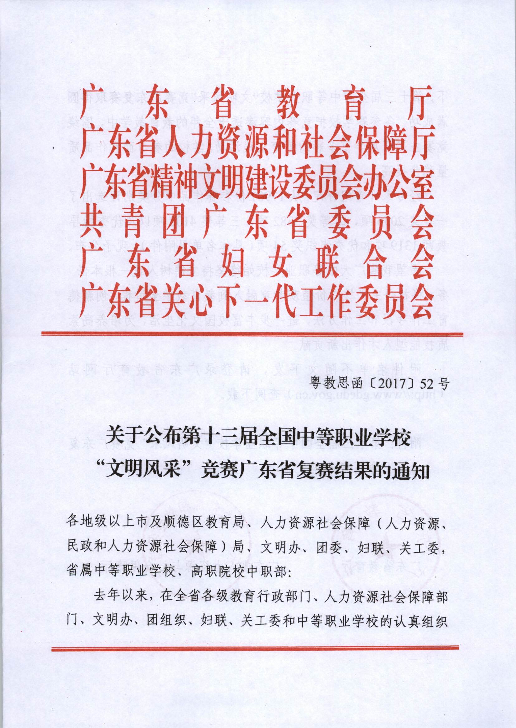根据《教育部等七部门关于进一步开展中等职业学校“文明风采”竞赛活动 促进活动育人的意见》精神,广东省教育厅、人力资源与社会保障厅、省文明办、共青团广东省委员会、省妇女联合会、省关心下一代工作委员会等部门联合组织第十三届全国中等职业学校“文明风采”竞赛广东复赛,本届竞赛以“弘扬工匠精神,成就出彩人生”为主题,共设4类赛项。