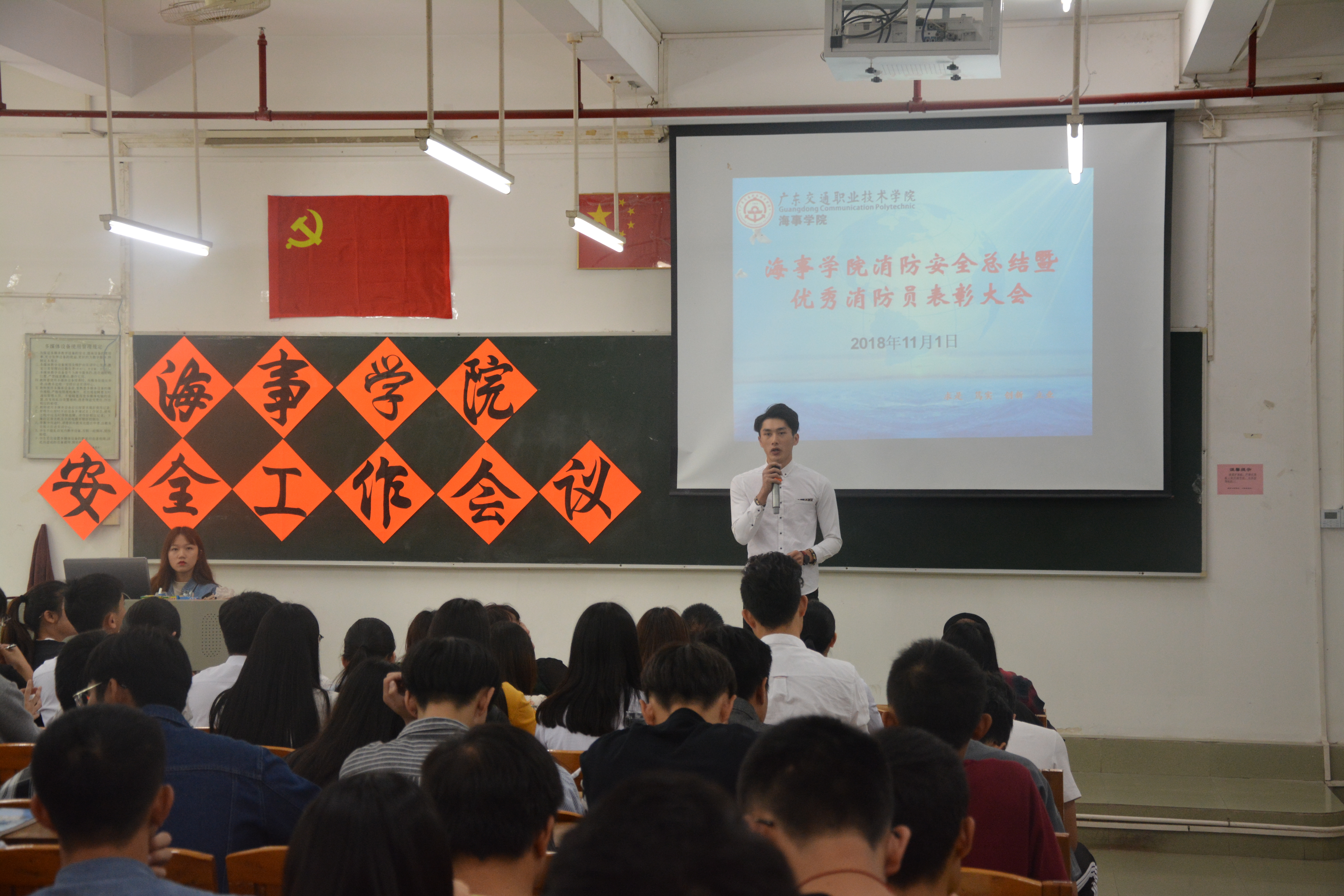 会议共分为两部分。第一部分是海事学院消防安全总结暨优秀消防员表彰大会,第二部分是海事学院安全工作会议。会议首先是由第一届消防队长庄嘉仕同学做消防安全工作总结,他指出同学们在生活中有滥用大功率违规电器、喜欢在宿舍抽烟、出宿舍门忘关电闸等不良现象,并告诉了大家这些现象将会产生怎样的后果,同时也寄希望大家做到人人遵守校园安全管理规章制度,共建平安校园。然后,由我院刘青书记和黄峰老师为第一届消防队员颁发聘书,以及为优秀志愿消防队员颁发优秀队员证书。最后是我们志愿消防队队旗交接仪式。