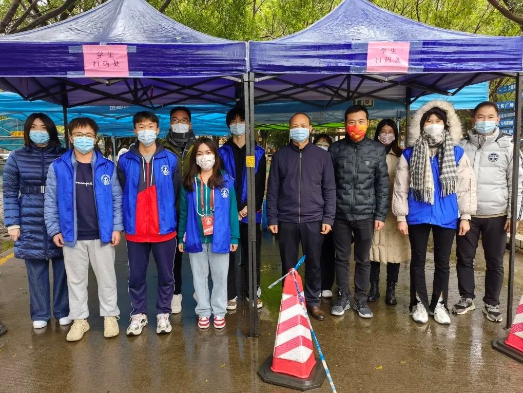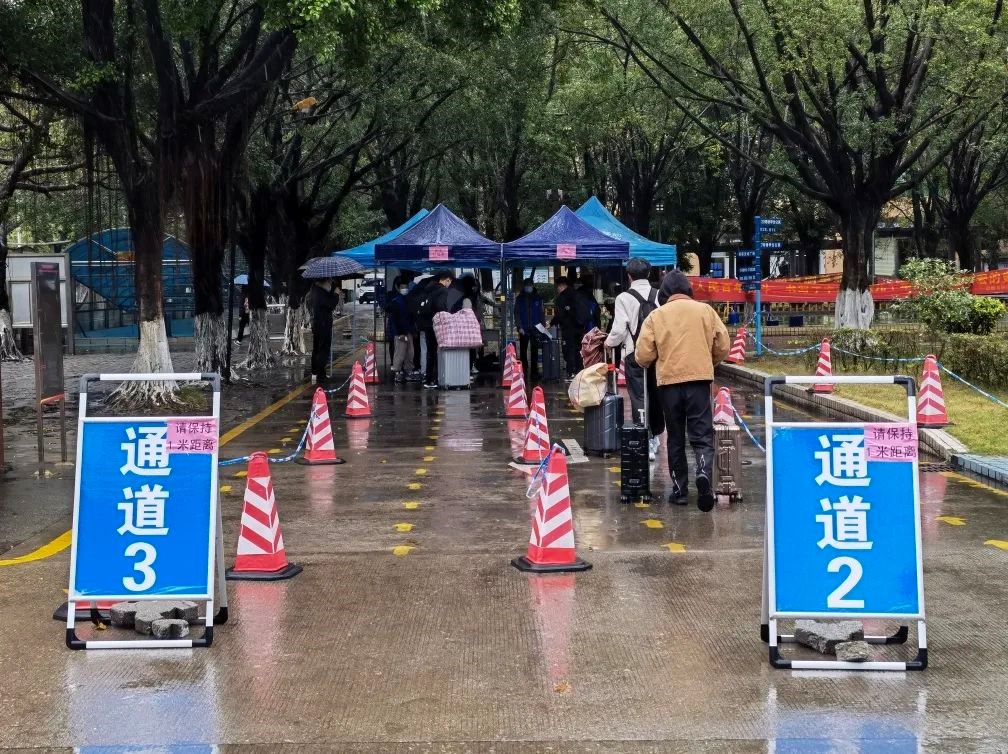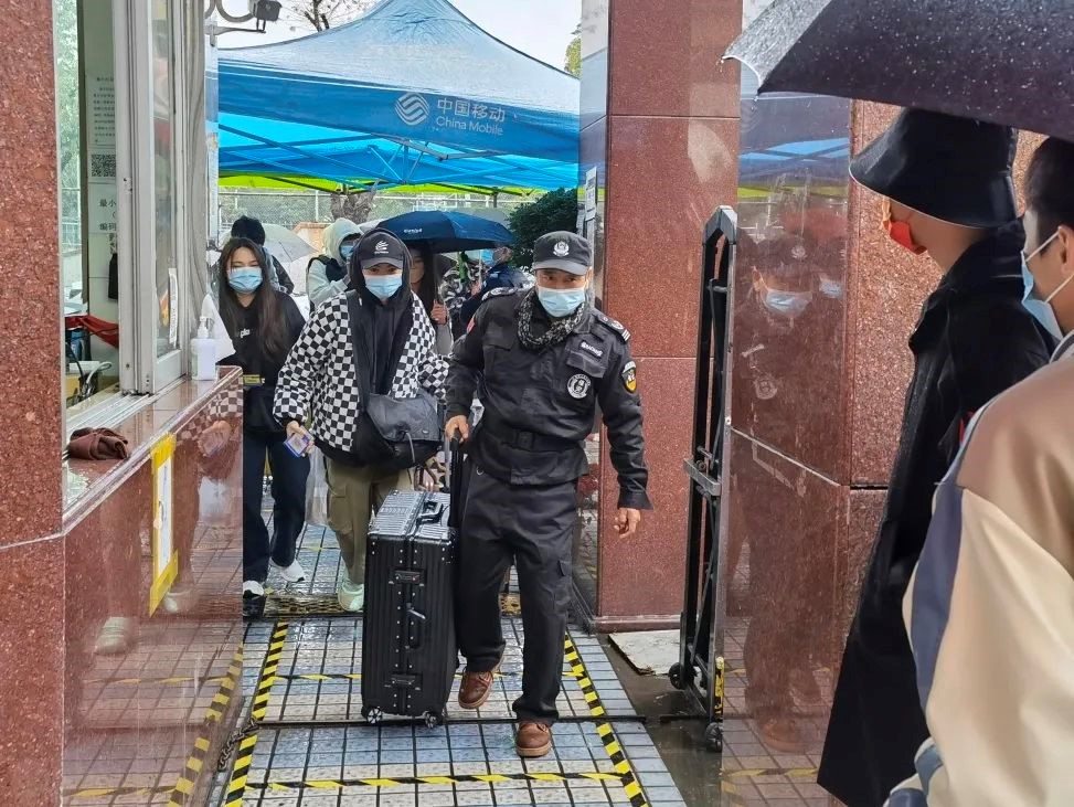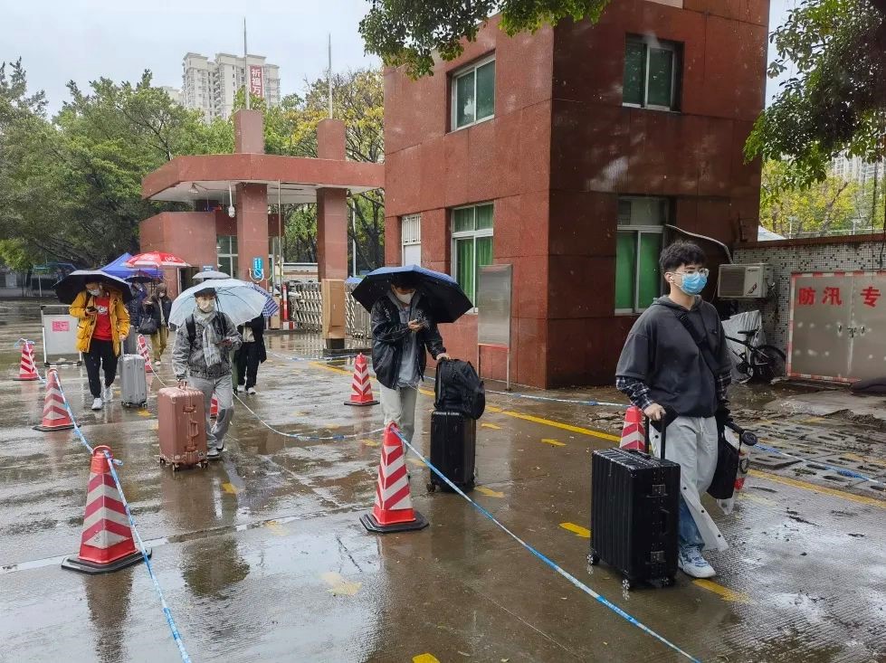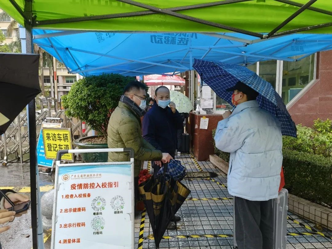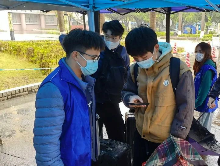 为了确保师生校园安全,共同做好防疫工作,花都校区设立了多个返校通道,海事学院学生志愿者们和老师们早早到达现场,迎接学生返校,对学生进行复测体温、核验身份、检查健康码,并在奕辅导小程序确认返校等流程完成报到程序。